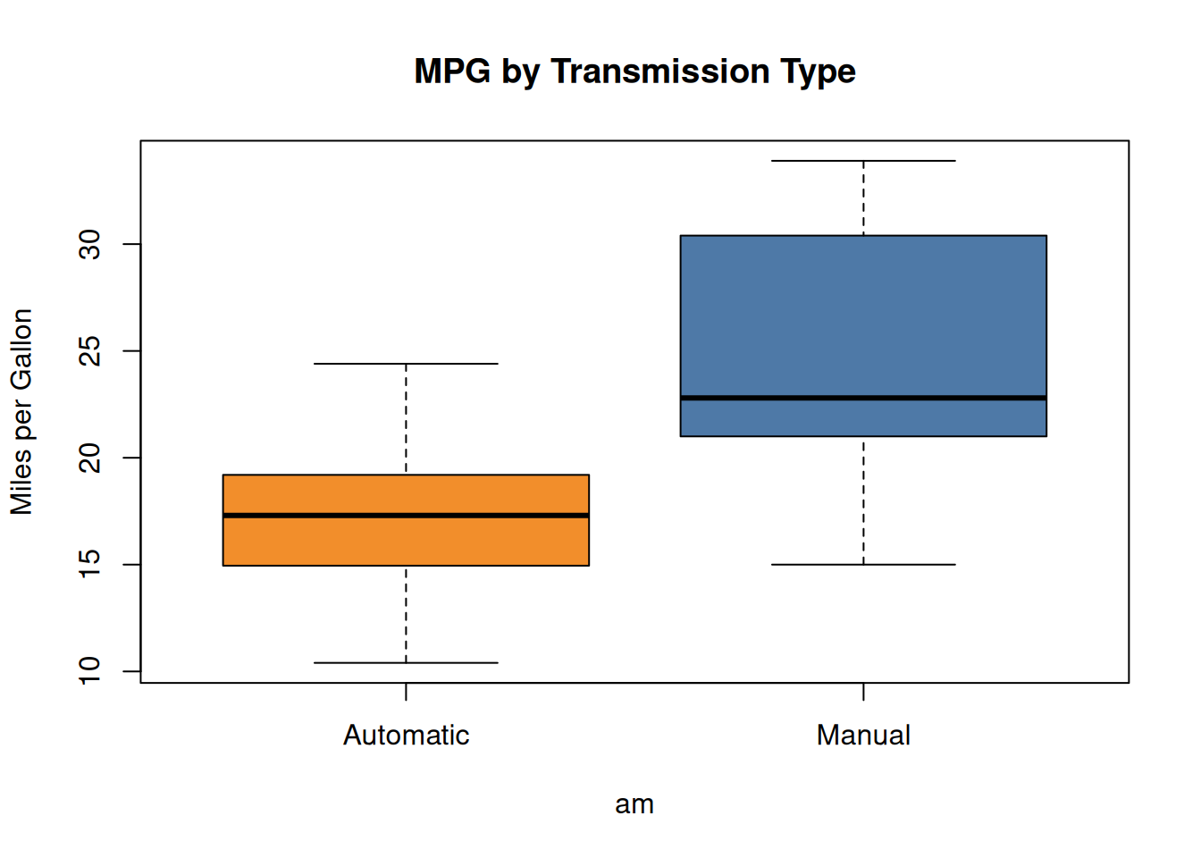 boxplot(mpg ~ am, data = mtcars,