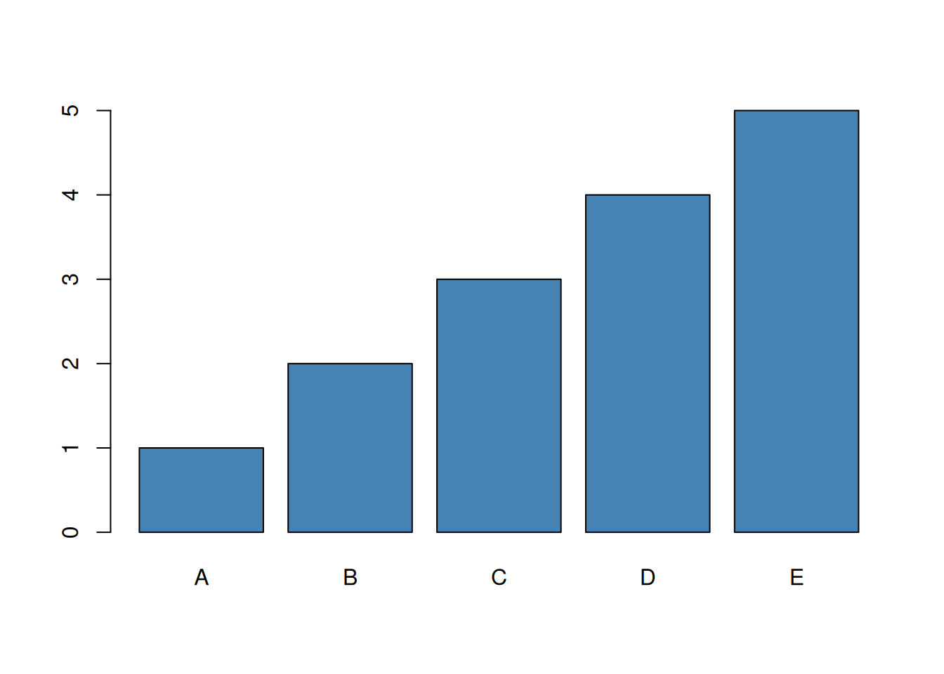 barplot(1:5, names.arg = LETTERS[1:5], col = "steelblue")